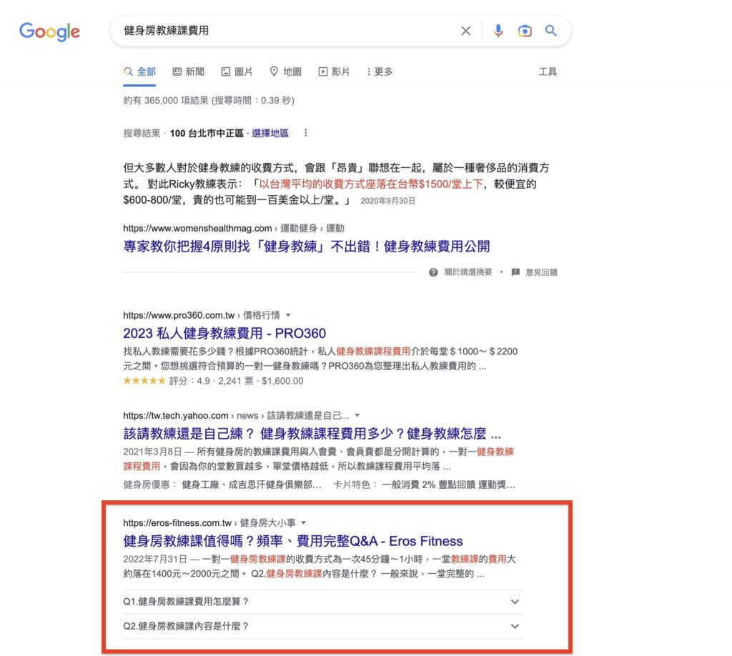 舉例,像是我們在Google搜尋「健身房教練課費用」時,在搜尋結果中,可以看到某健身工作室所撰寫的知識文章。